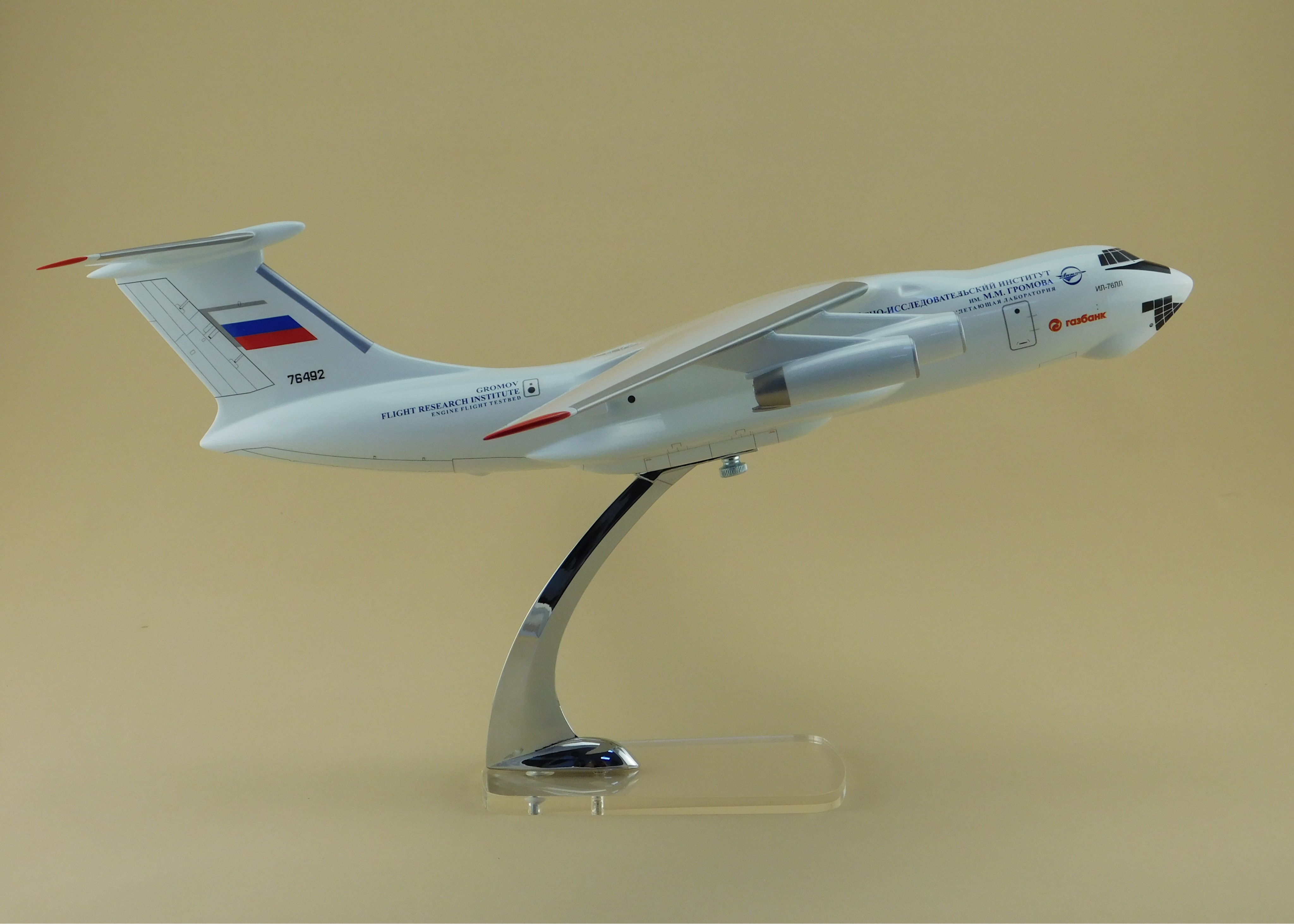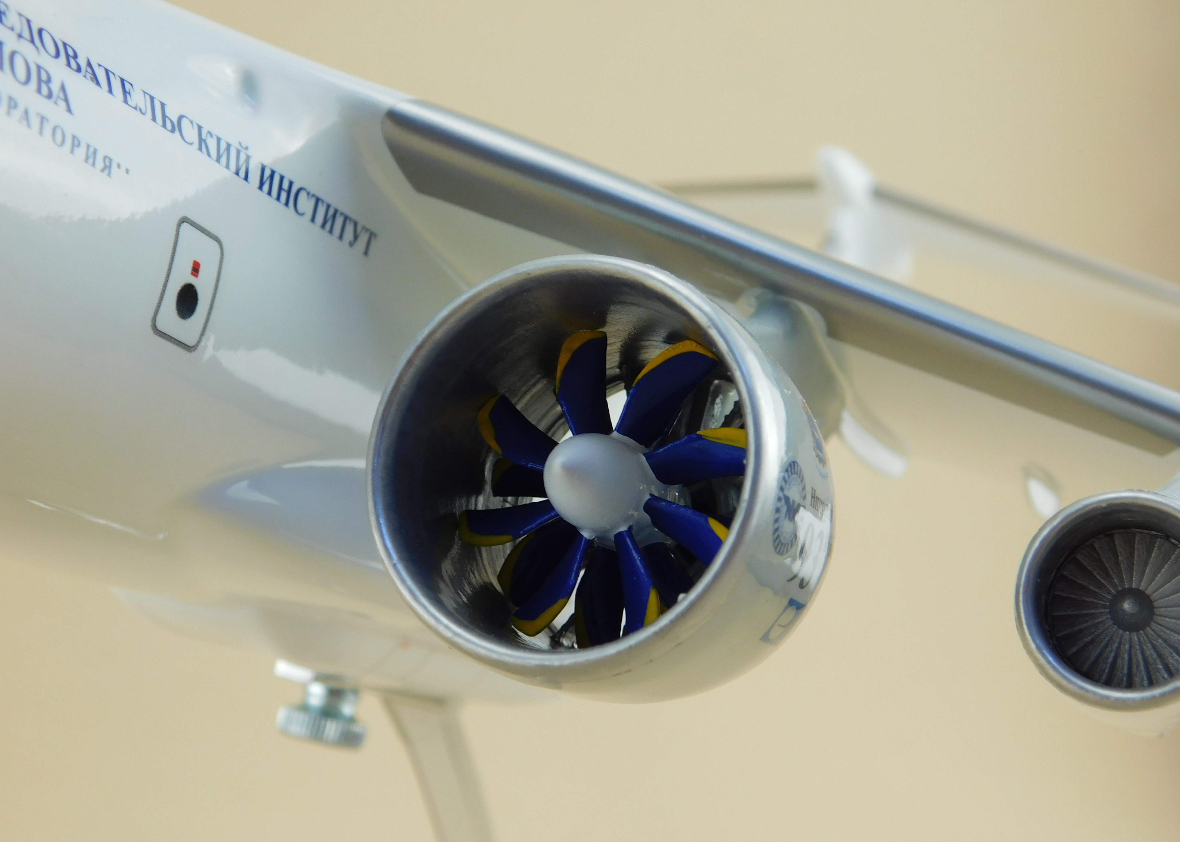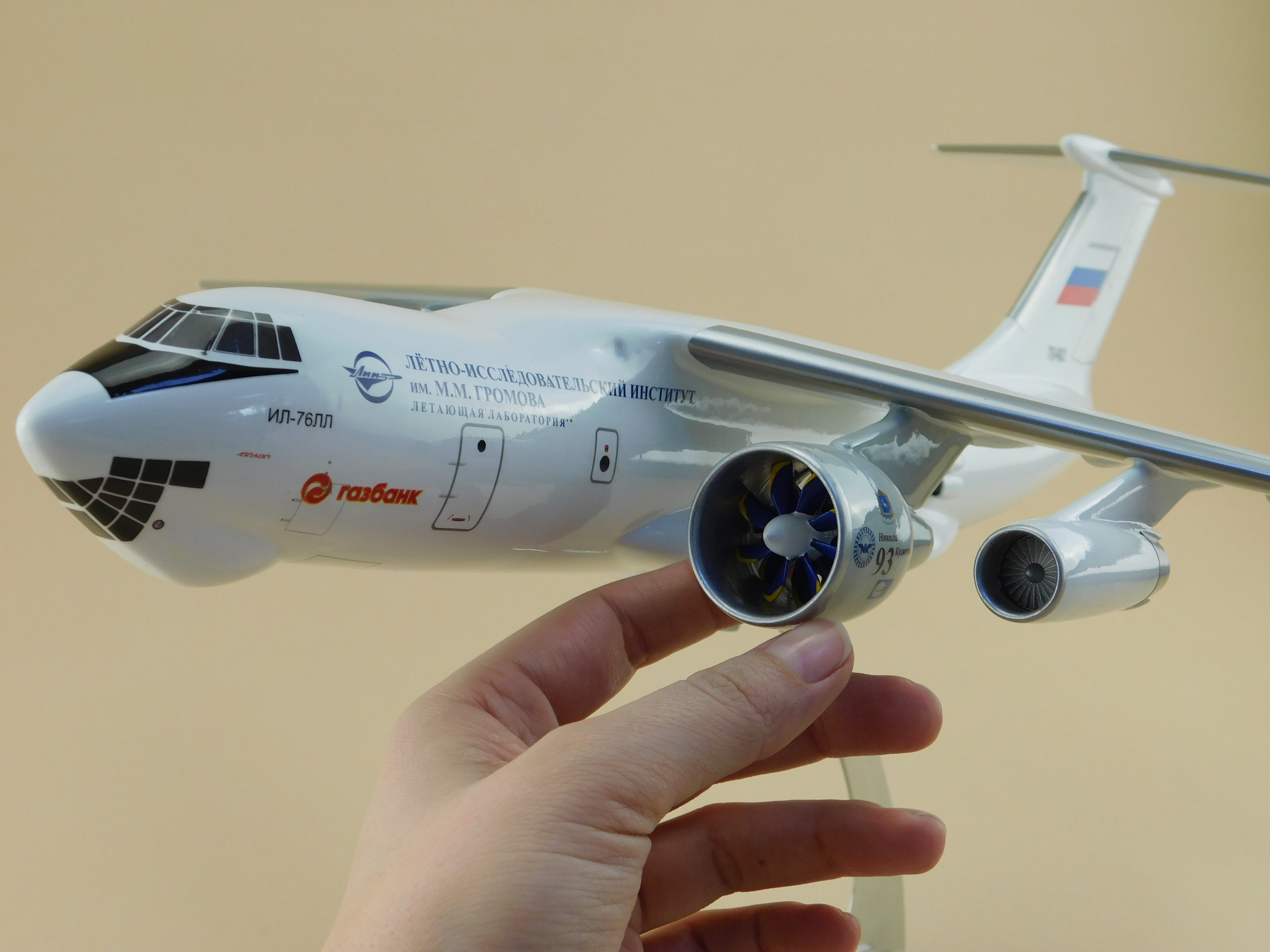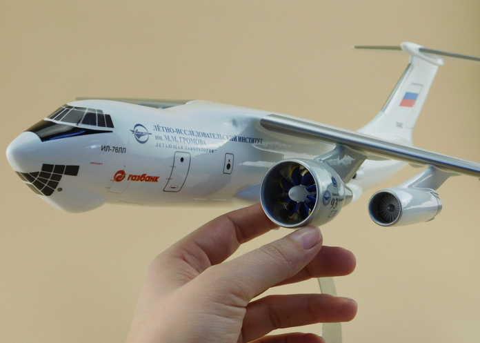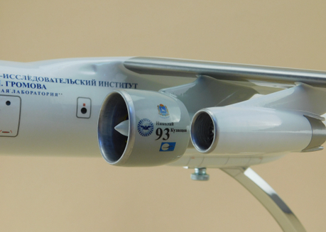 Перед вами модель уникального летающего лабораторного комплекса на базе Ил-76, при испытаниях двигателя НК-93. Этот винтовентиляторный двигатель, сочетающий экономичность турбовинтового и скорость турбореактивного, в свое время был прорывной разработкой.
