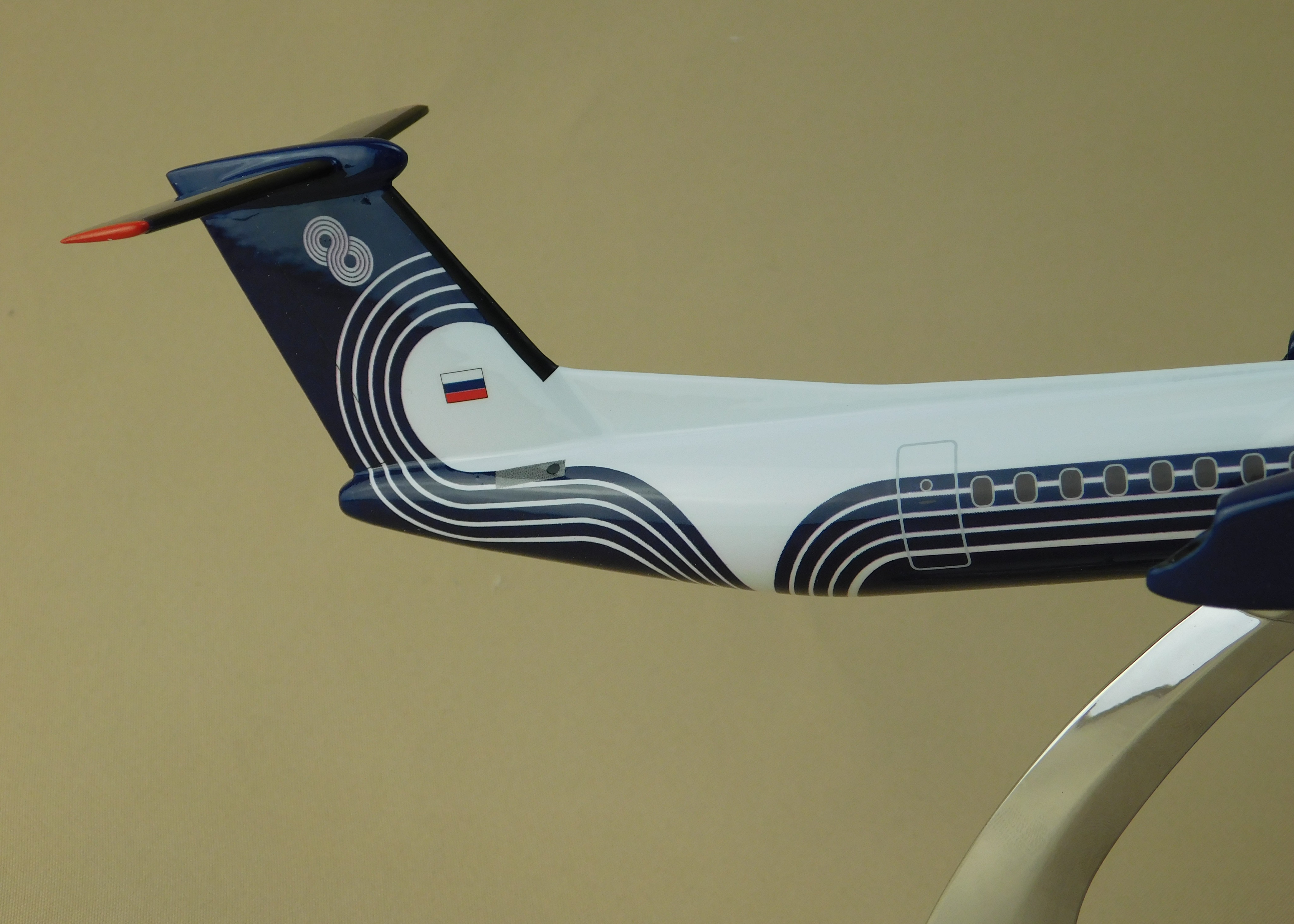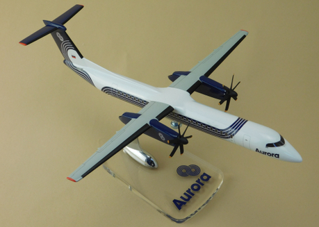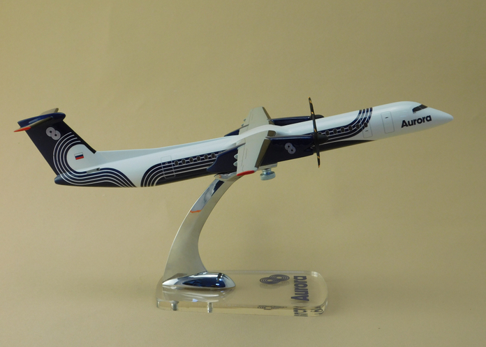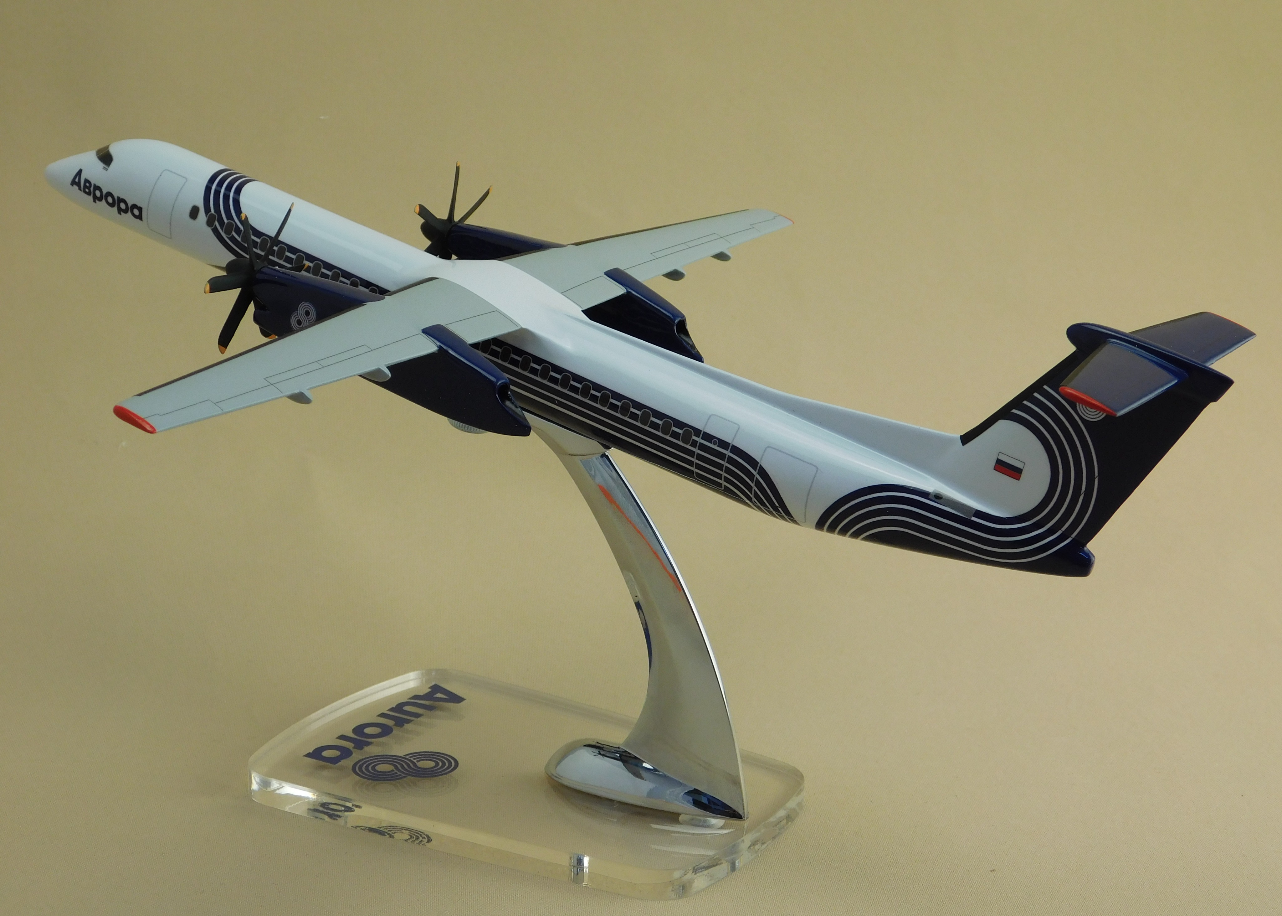 Модель регионального турбовинтового самолета DHC-8-Q400 в ливрее авиакомпании «Аврора». Этот канадский лайнер, известный своей надежностью и экономичностью, является важной частью флота «Авроры», связывая маршрутами Дальний Восток и другие регионы России.